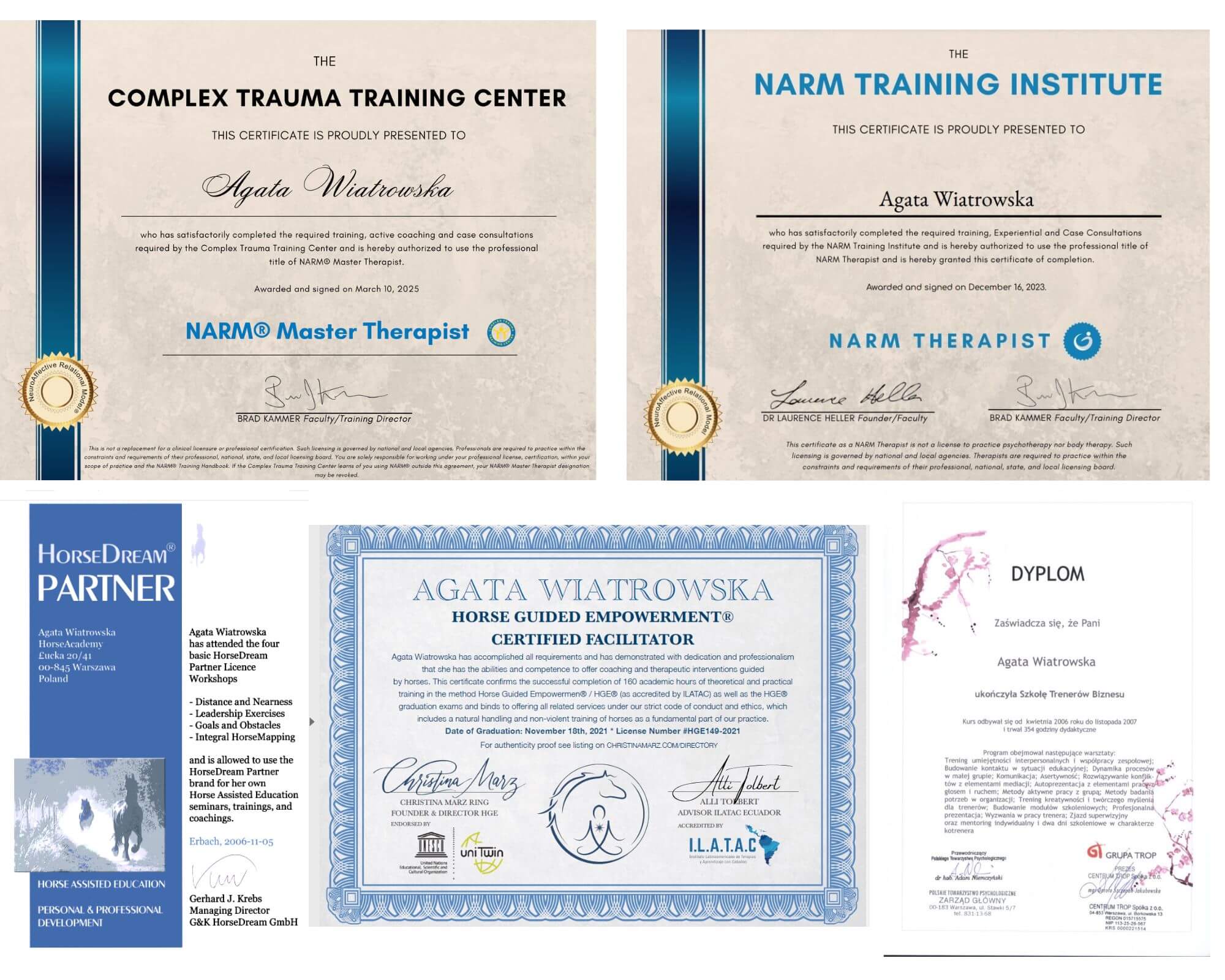 Agata Wiatrowska – certyfikowany facylitator programów rozwojowych i terapii z końmi (certyfikat mistrzowski EAHAE, licencja HorseDream, Horse Guided Empowerment) z międzynarodową akredytacją do uczenia innych, psycholog (prowadziłam badania nad związkiem poczucia własnej skuteczności i uczeniem się przez doświadczenie u uczestniczek programów rozwojowych z końmi, porównując do grupy kontrolnej), terapetuka traumy relacyjnej NARM (Neuroafektywny model relacyjny NARM™ Level 2 i Level 3 -Master Therapist – 3 letnie całościowe szkolenie), certyfikowany coach (Grupa TROP), trener II stopnia (poziom treningu interpersonalnego wg. Polskiego Towarzystwa Psychologicznego), dyrektorka międzynarodowego stowarzyszenia European Association for Horse Assisted Education (EAHAE), właścicielka firmy i ośrodka HorseSense. Autorka podcastu i książek o rozwoju z końmi oraz bestsellera „Psychologia relacji człowieka z koniem”, 2021 „Koń jako trener. O programach rozwojowych z końmi oraz lekcjach od koni-trenerów”, 2016, „Menedżer uczy się od koni” 2013, “Wyprawa po MOC”, 2022. Ma wieloletnie doświadczenie menedżerskie pracy w firmie konsultingowej PwC zarówno w Polsce, jak i w Niemczech. Pracuje pod stałą indywidualną i grupową superwizją zarówno w nurcie NARM, jak i u superwizorów humanistyczno-doświadczeniowych (ok. 4 spotkań miesięcznie).